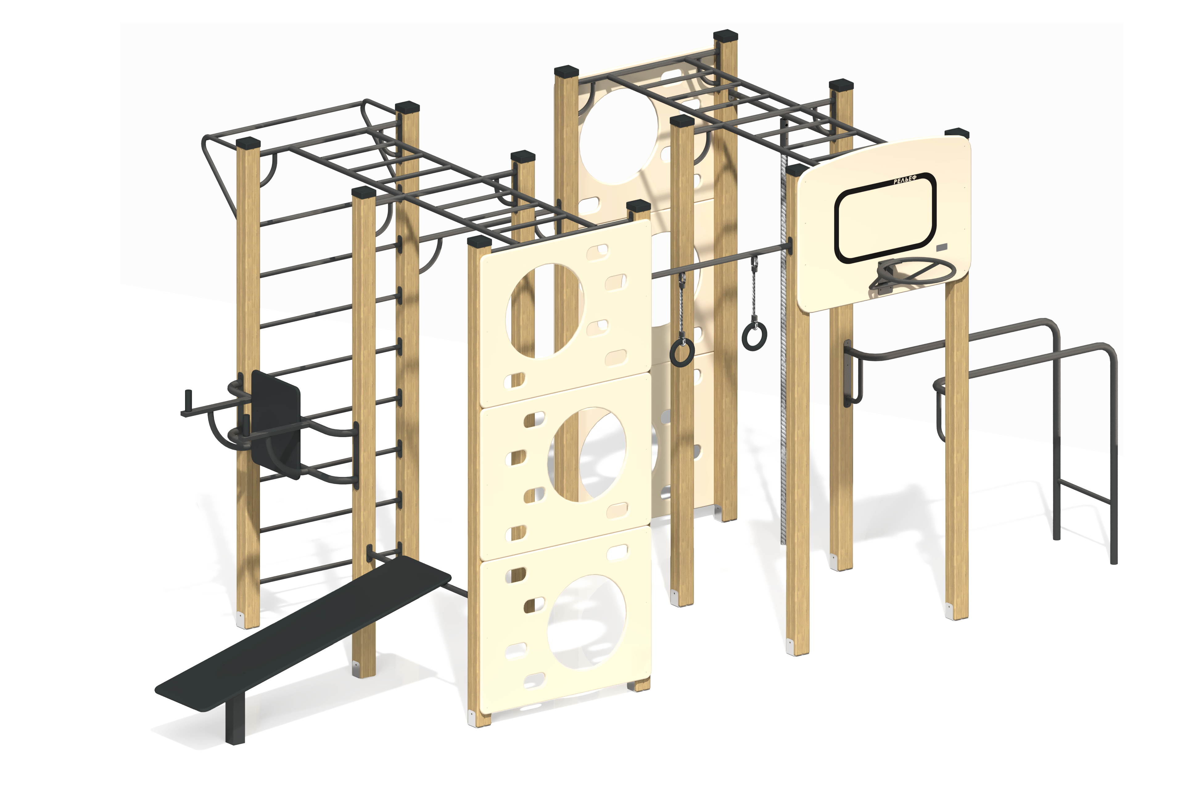 Экологичный и прочный Гимнастический комплекс на деревянных столбах ГК-38 для спортивной площадки, натуральные материалы и безопасность.