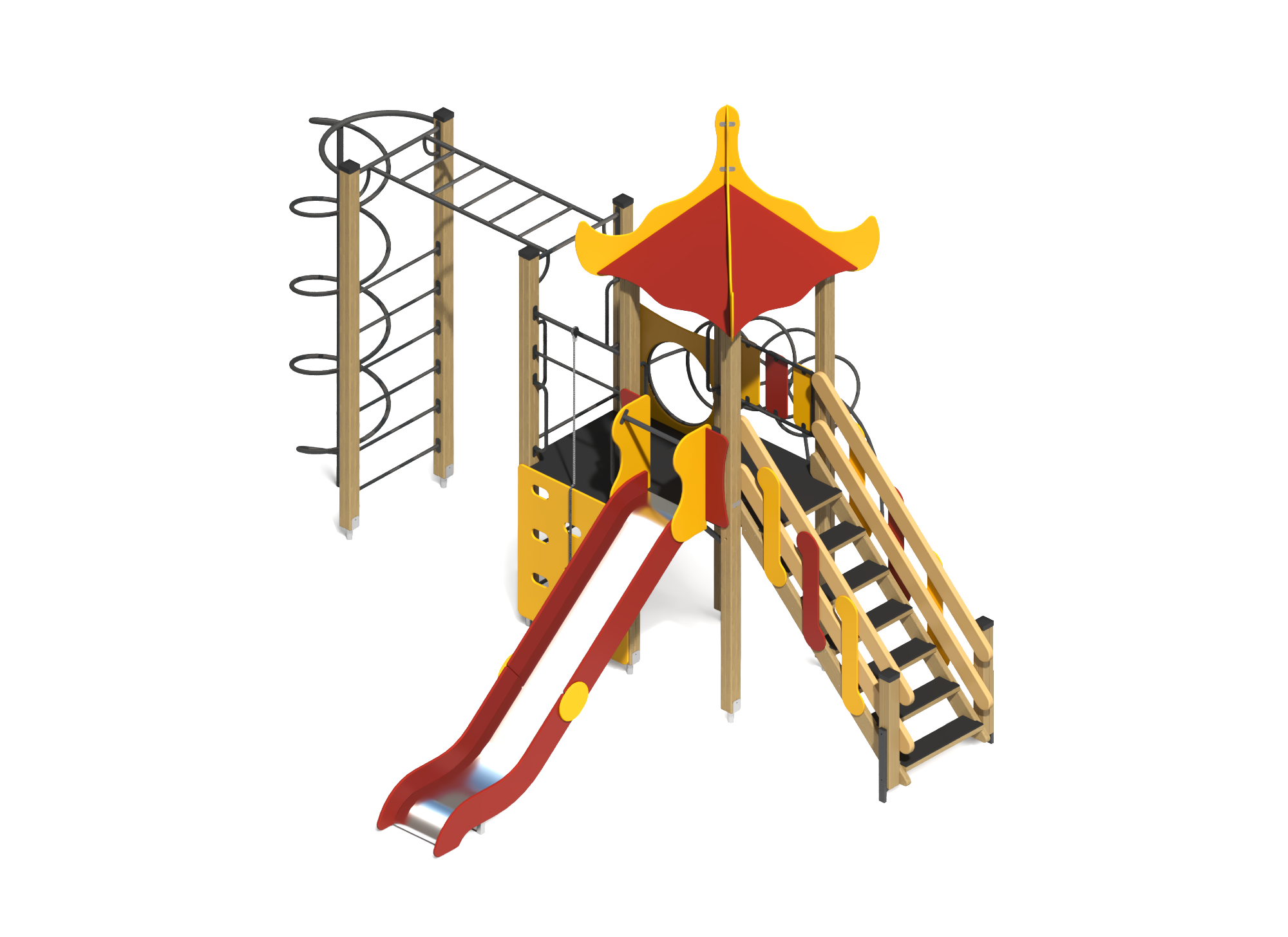Уникальный Игровой комплекс с ламинированным полом Нгр=1500 ИК-09, предоставляющий комфортное и безопасное пространство для детских игр на свежем воздухе.