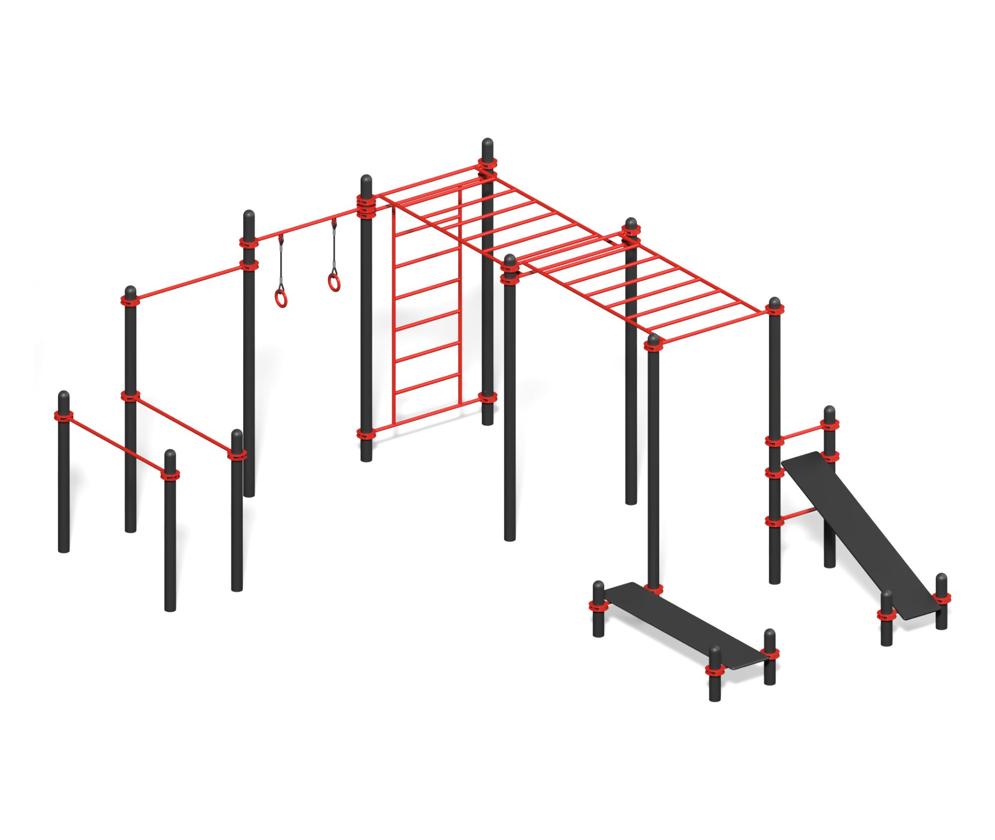 Турники - основа воркаута. Позволяют эффективно тренировать спину, плечи и руки через подтягивания, подъёмы и удержания. Несколько турников разной высоты и конфигурации делают тренировки максимально вариативными.\n\nРукоход - для развития силы хвата, укрепления плечевого пояса и мышц спины. Отлично подходит для функциональных тренировок и улучшения координации.\n\nСкамья для пресса - снаряд для эффективной проработки мышц брюшного пресса. Даёт возможность выполнять скручивания, подъёмы ног, планки и другие упражнения с правильной фиксацией тела.\n\nШведская стенка - универсальный элемент для упражнений на пресс, спину и гибкость. Позволяет выполнять подтягивания, подъёмы ног, растяжку и вспомогательные упражнения.\n\nБрусья - классика силовых тренировок. Идеальны для проработки грудных мышц, трицепсов и пресса. Дают возможность выполнять отжимания с разной шириной постановки рук и амплитудой движения.\n\nГимнастические кольца - универсальный инструмент для силовых и функциональных тренировок. Позволяют выполнять подтягивания, отжимания, удержания, подъёмы тела и сложные статические упражнения. Развивают силу, гибкость и стабилизацию корпуса.\n\nКонструкция выполнена из прочных материалов, устойчивых к погодным условиям и интенсивной эксплуатации.\n\nНачните свои тренировки на воркаут‑комплексе - и почувствуйте, как растёт ваша сила, выносливость и энергия!